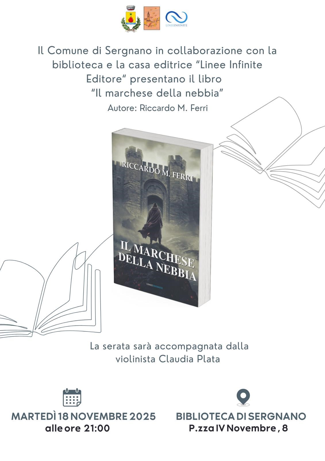 La Biblioteca Comunale, in collaborazione con la casa editrice Linee Infinite, organizza la presentazione del libro "Il Marchese della Nebbia" di Riccardo Ferri. Appuntamento con l'autore per la serata di martedì 18 novembre 2025 alle ore 21.00 presso la Biblioteca. L'evento sarà accompagnato dall'esibizione musicale dela violinista Claudia Plata.