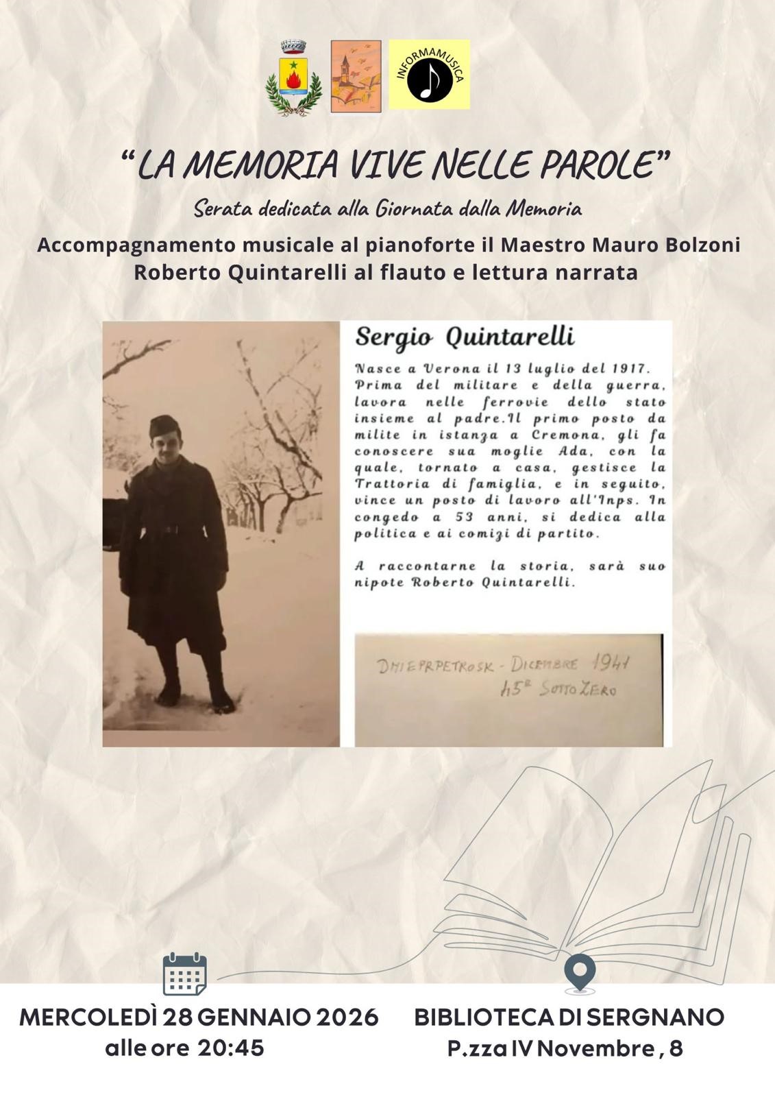 In occasione della Giornata della Memoria per le vittime della Shoah, la Biblioteca Comunale organizza un'iniziativa dal titolo "La memoria vive nelle parole" con il racconto della storia di Sergio Quintarelli. Accompagnamento musicale da parte del Maestro Mauro Bolzoni con Roberto Quintarelli al flauto e lettura narrata. Appuntamento per la serata di mercoledì 28 gennaio 2026 alle ore 20.45 presso la Biblioteca Comunale di Sergnano.
