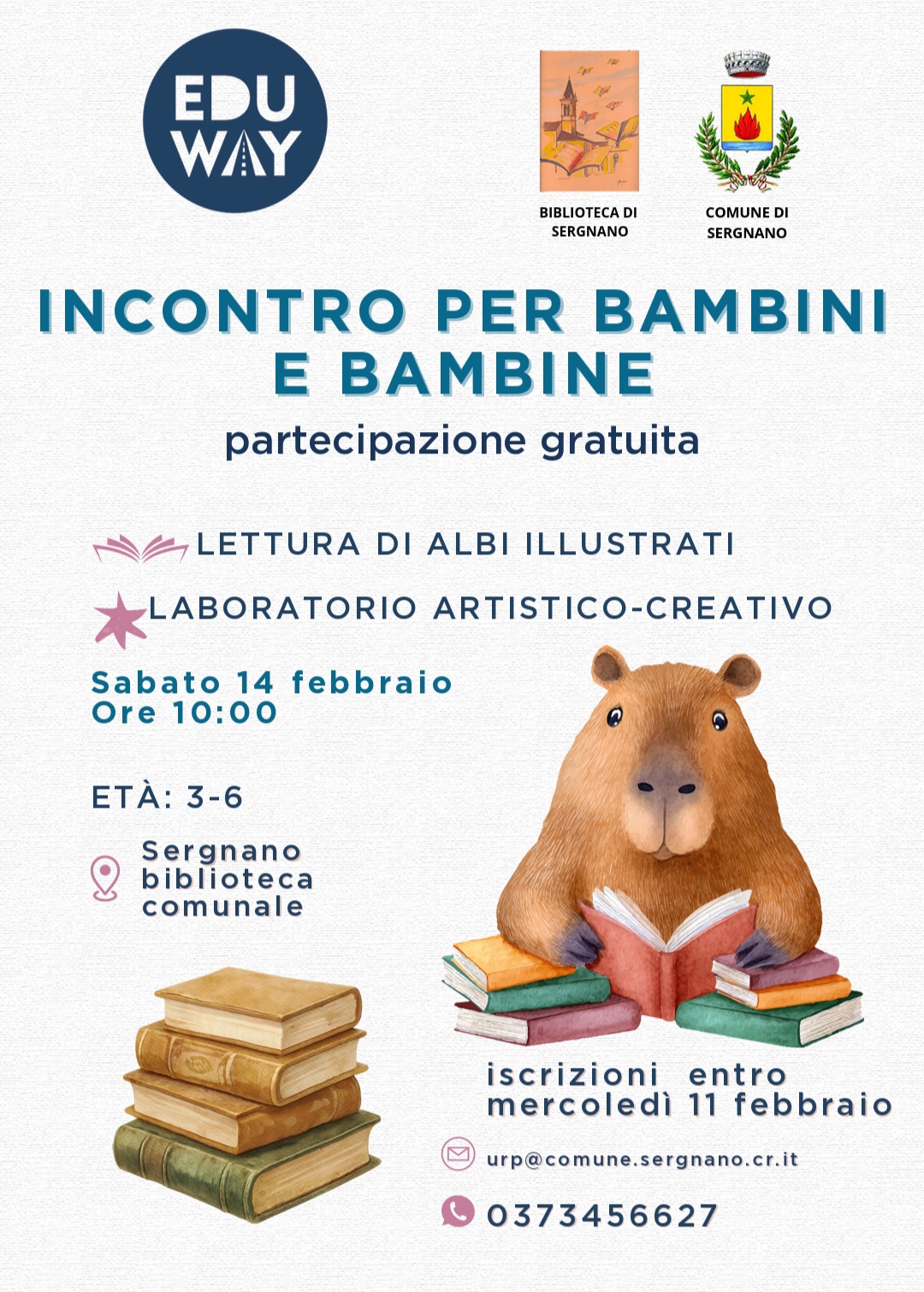 La Biblioteca Comunale organizza un laboratorio artistico-creativo con letture per bambini nella giornata di sabato 14 febbraio 2026 dalle ore 10.00 presso la Biblioteca Comunale di Sergnano. Iscrizioni entro entro il giorno 11.02.2026 al numero tel. 0373/456627 oppure via mail all'indirizzo di posta elettronica: urp@comune.sergnano.cr.it