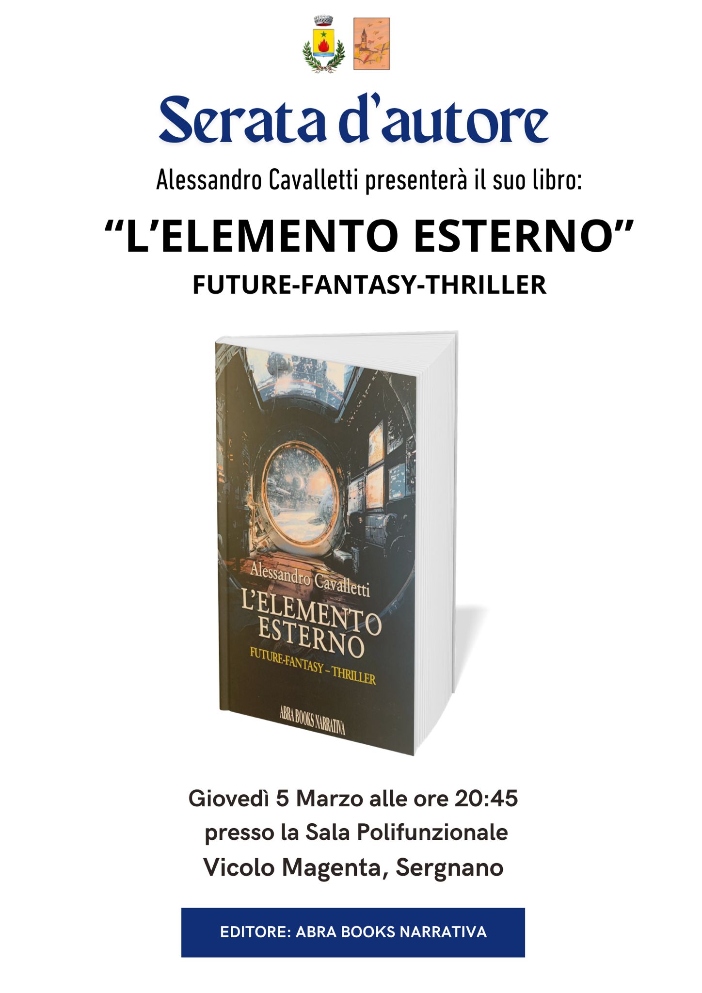 La Biblioteca Comunale, in collaborazione con la casa editrice Abra Books, organizza la presentazione del libro "L'elemento esterno" di Alessandro Cavalletti. Appuntamento con l'autore per la serata di giovedì 05 marzo 2026 alle ore 20.45 presso il Centro Polifunzionale di Vicolo Magenta.