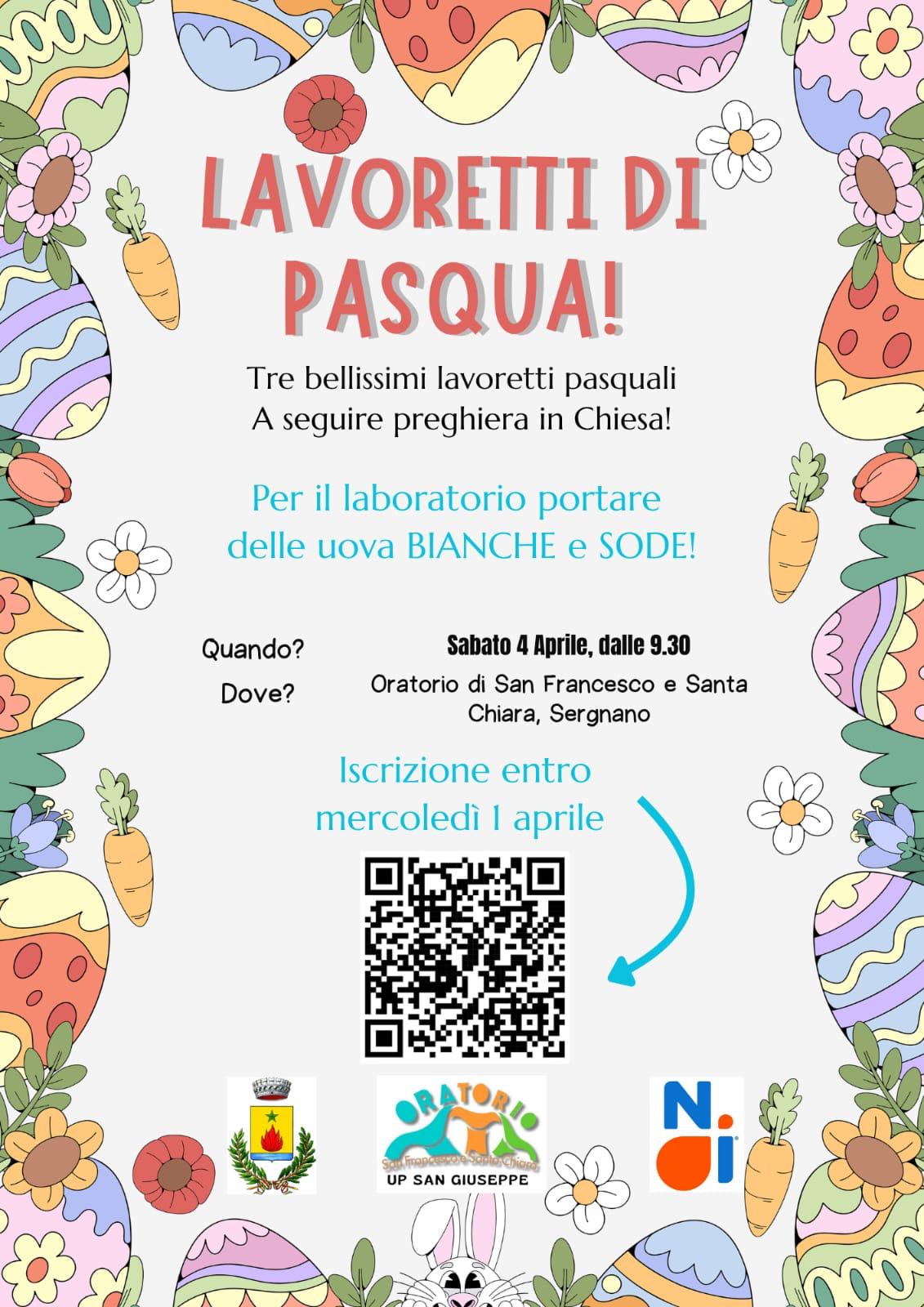 L'Oratorio parrocchiale "San Francesco e Santa Chiara" e il Comune di Sergnano organizzano il laboratorio creativo "Lavoretti di Pasqua" per decorare le uova sode da portare in chiesa per la benedizione prima della festività pasquale. Appuntamento per la mattinata di sabato 04 aprile 2026 alle ore 09.30 presso l'Oratorio di Sergnano.