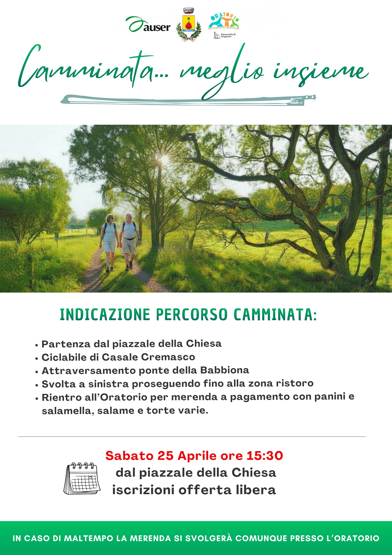 Il Circolo Auser "Al Mirabel" e l'Oratorio parrocchiale, in collaborazione con il Comune di Sergnano, organizzano l'iniziativa "Camminata...meglio insieme" in occasione della Giornata della Liberazione. Appuntamento per il giorno sabato 25 aprile 2026 con partenza alle ore 15.30 dal Piazzale della Chiesa. Costo di iscrizione per i partecipanti ad offerta libera.