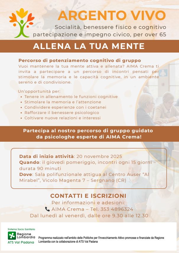 L'associazione AIMA Crema, nell'ambito delle politiche per l'invecchiamento promosse e finanziate da Regione Lombardia in collaborazione con ATS Val Padana, organizza il percorso di potenziamento cognitivo di gruppo denominato "Argento Vivo". Si tratta di una serie di incontri, riservati alle persone con età maggiore di 65 anni, pensati per stimolare la memoria e le capacità cognitive in un ambiente sereno e di condivisione.