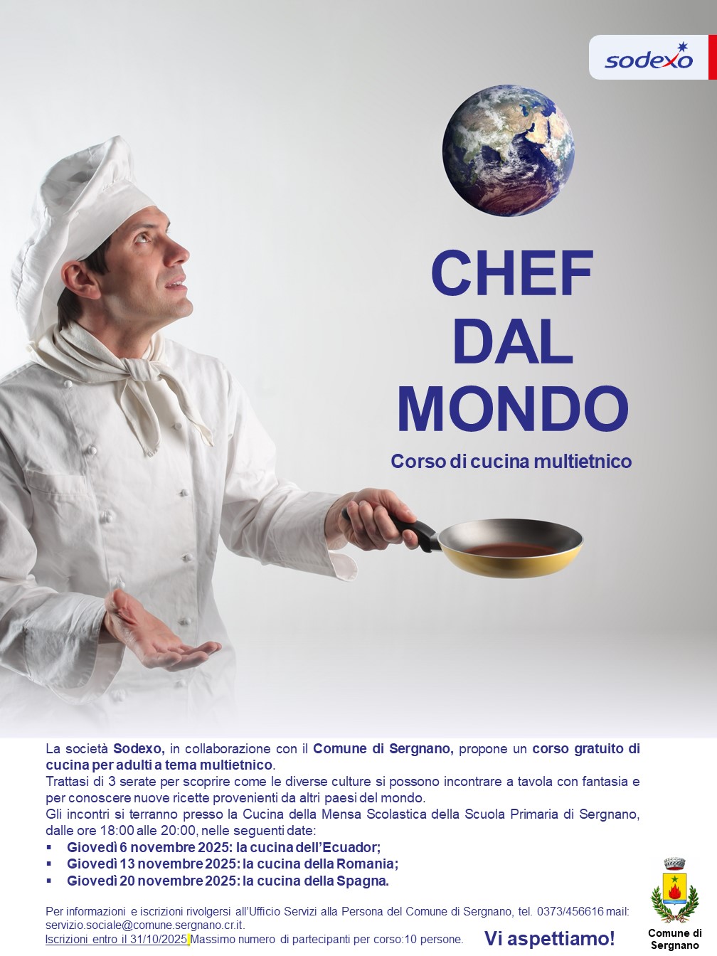 La società Sodexo, in collaborazione con il Comune di Sergnano, propone un corso gratuito di cucina per adulti a tema multietnico. Si tratta, nello specifico, di n°3 serate per scoprire come le diverse culture si possono incontrare a tavola con fantasia e per conoscere nuove ricette provenienti da altri paesi del mondo.